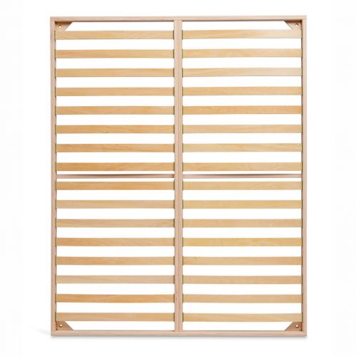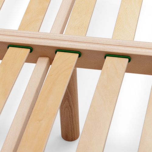 La fabbricazione di questa rete a doghe si basa sulla tradizione artigianale: ogni doga è collegata al telaio con un sistema di mortase solido ed esteticamente gradevole. I tappi di chiusura, robusti, resistenti e silenziosi, proteggono le doghe al loro posto.
