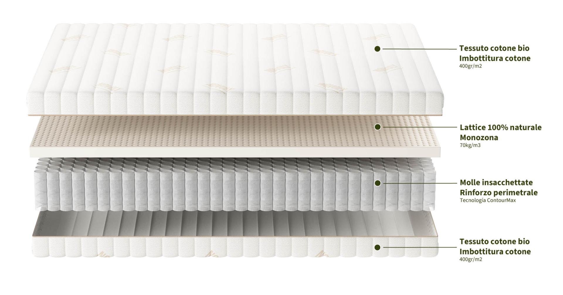 La sua base è costituita da una lastra di lattice naturale biologico certificato che offre un'incredibile elasticità per adattarsi alla forma del corpo e alleviare i punti di pressione in qualsiasi posizione si dorma.